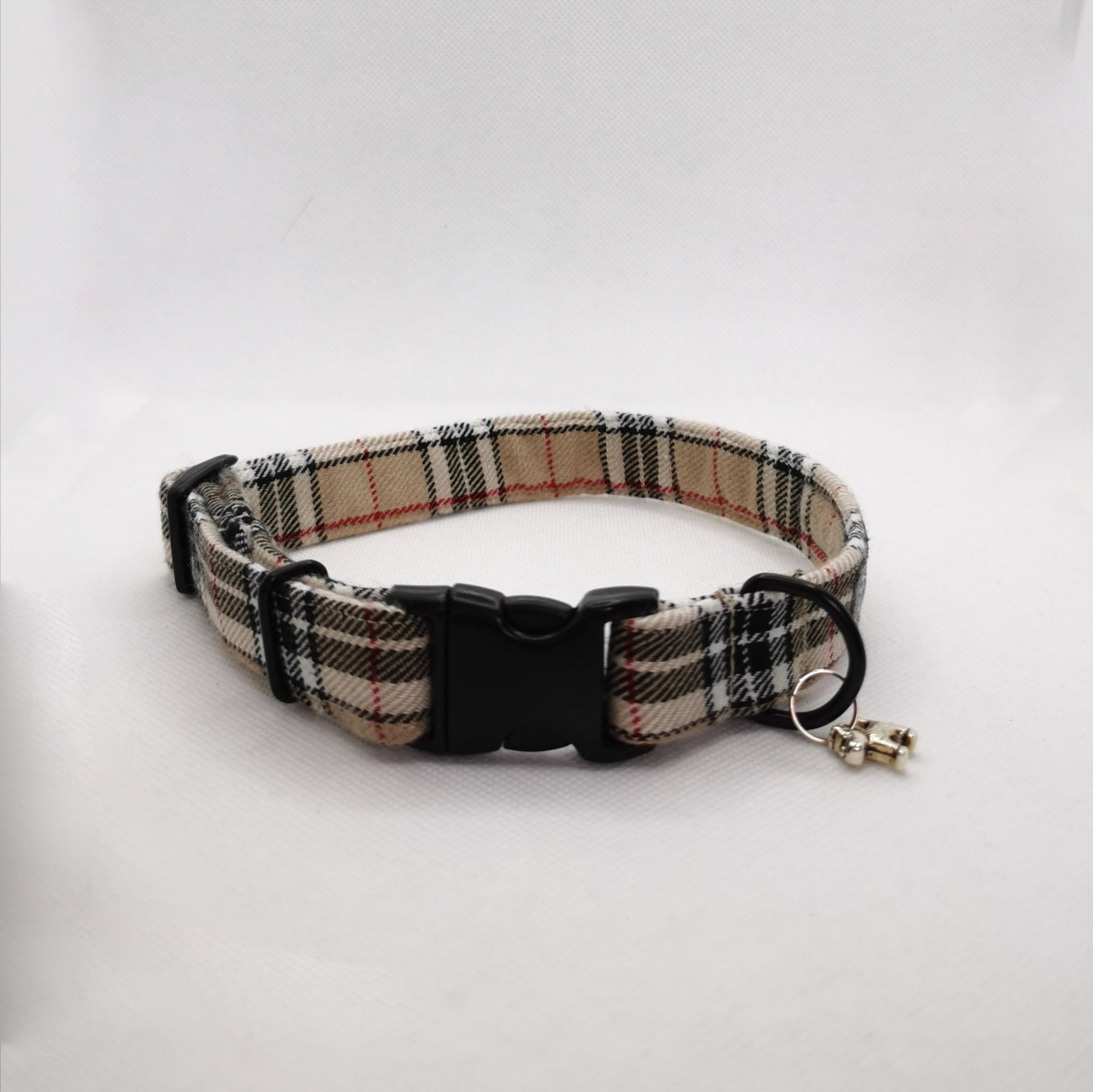 A stylish beige traditional dog collar made with tartan fabric.